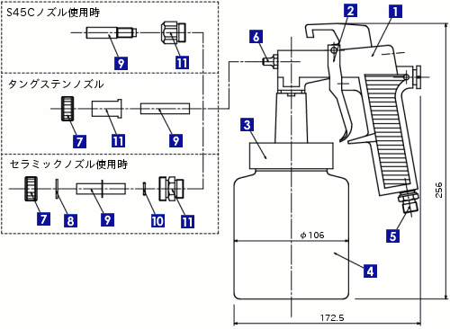 金属、プラスチック、コンクリート、石、煉瓦、ガラス等の錆、薄皮、腐食汚れ、塗装、泥落としに最適です。液体洗浄剤を入れることで洗浄をすることも可能です。1馬力以上のコンプレッサーにつないで使用します。